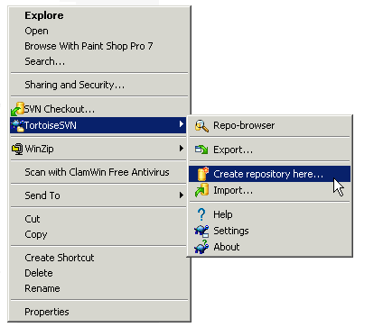Right click on that newly created folder and select TortoiseSVN -> Create repository here...