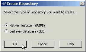 A new popup window will appear asking you to select the type of repository, choose Native filesystem (FSFS) and click on OK